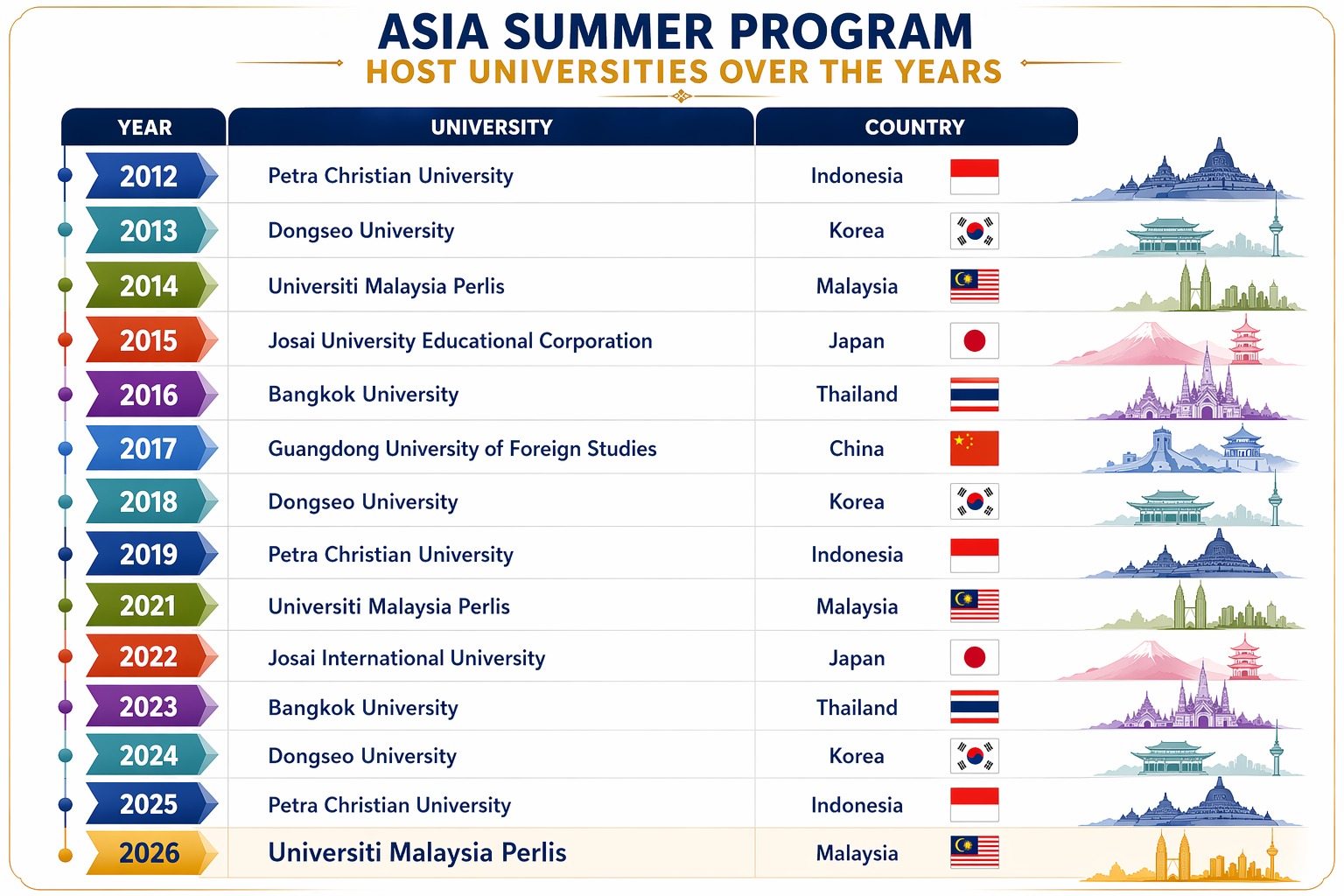 Since its inception in 2012, the Asia Summer Program has evolved into a hallmark of regional educational cooperation. Following the success of previous cycles in Japan, South Korea, Thailand, and Indonesia, ASP 2026 at UniMAP continues the mission of creating a "borderless campus." We invite you to be part of this legacy and experience the warmth of Malaysian hospitality while sharpening your global edge.